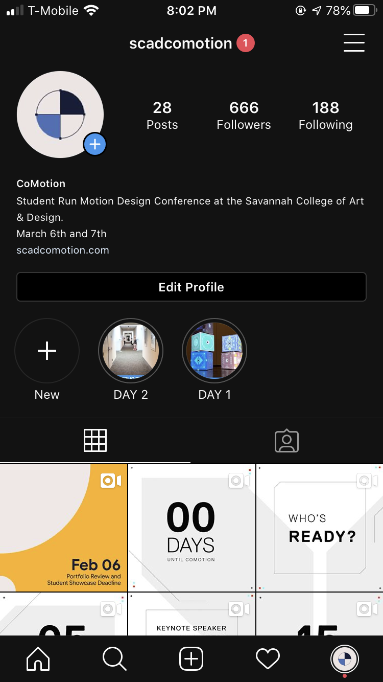 CoMotion is a student-led motion graphics conference at SCAD that invites industry professionals to connect with students through portfolio reviews, panel discussions, and a student showcase. In 2020, I had the awesome opportunity to be a part of the graphic design team where I designed and animated the social media grid as well as prep print assets for the event.